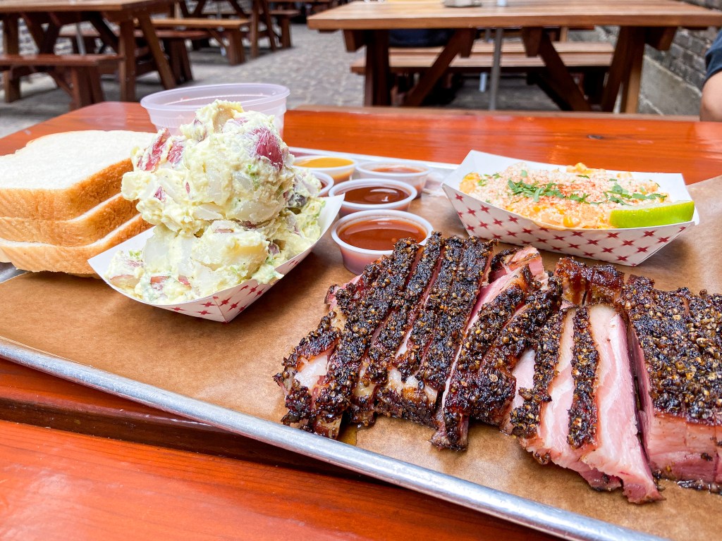 Lunch / After you grab a cup of joe, enjoy lunch at Green Street Smoked Meats for some amazing Texas-inspired BBQ. It’s located directly behind Sawada Coffee, you can actually enter from Sawada coffee indoors. Indoors you’ll find long picnic tables, a full bar, and the cutest indoor string light set up overhead. Grab a drink first or head straight for the food line! Order tender brisket, pulled pork, or pork belly cooked to absolute perfection by the pound. Oh & trust me on this one, you’re gonna want to order a side of potato salad. Don’t skip out on those sides!