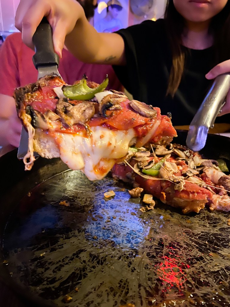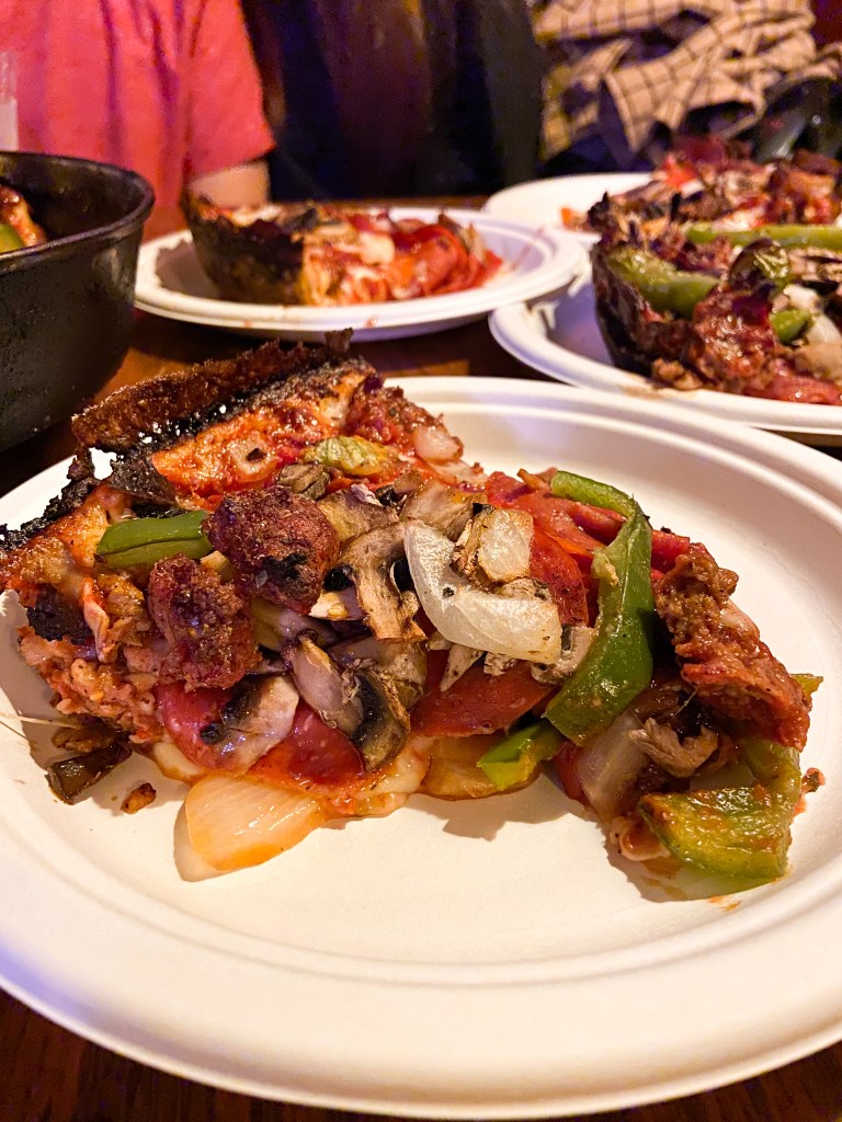 Pizza / Torn between trying Lou Malnati’s or Giodarno’s for an authentic Chicago deep dish pizza experience? I’ll save you the time and effort right now. Forget both of this places and just get your butt over to Pequods. Hands down this is the best deep dish pizza in chicago, no question about it! I tried Giordano’s the first day I visited Chicago several years ago and I thought it was good. Honestly I was very underwhelmed by Lou Malnati’s. I honestly found their big deep dish to be overly saucey which lead to a soggy thick crust. Being from the East Coast, I am definitely in favor of a good thin slice of NY Style pizza. But man, it wasn’t until I tried Pequods that I discovered I can actually enjoy deep dish pizza. The crust is cooked with cheese and fired in the oven to make a deliciously crisp and flavorful crust that holds the sauce, more cheese, and toppings in place. If I’m gonna wait 45+ minutes for a pizza to cook in the oven it better be darn stinking good, and trust me Pequod’s did not disappoint!